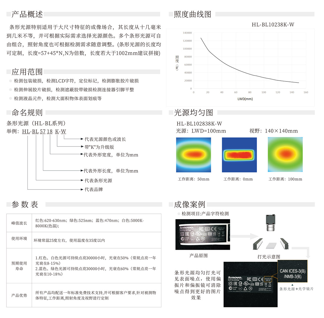 条形光源特别适用于大尺寸特征的成像场合,其长度从十几毫米到几米不等,并可根据实际需求选择光源颜色。多个条形光源可自由组合,照射角度也可根据检测需求随意调整。